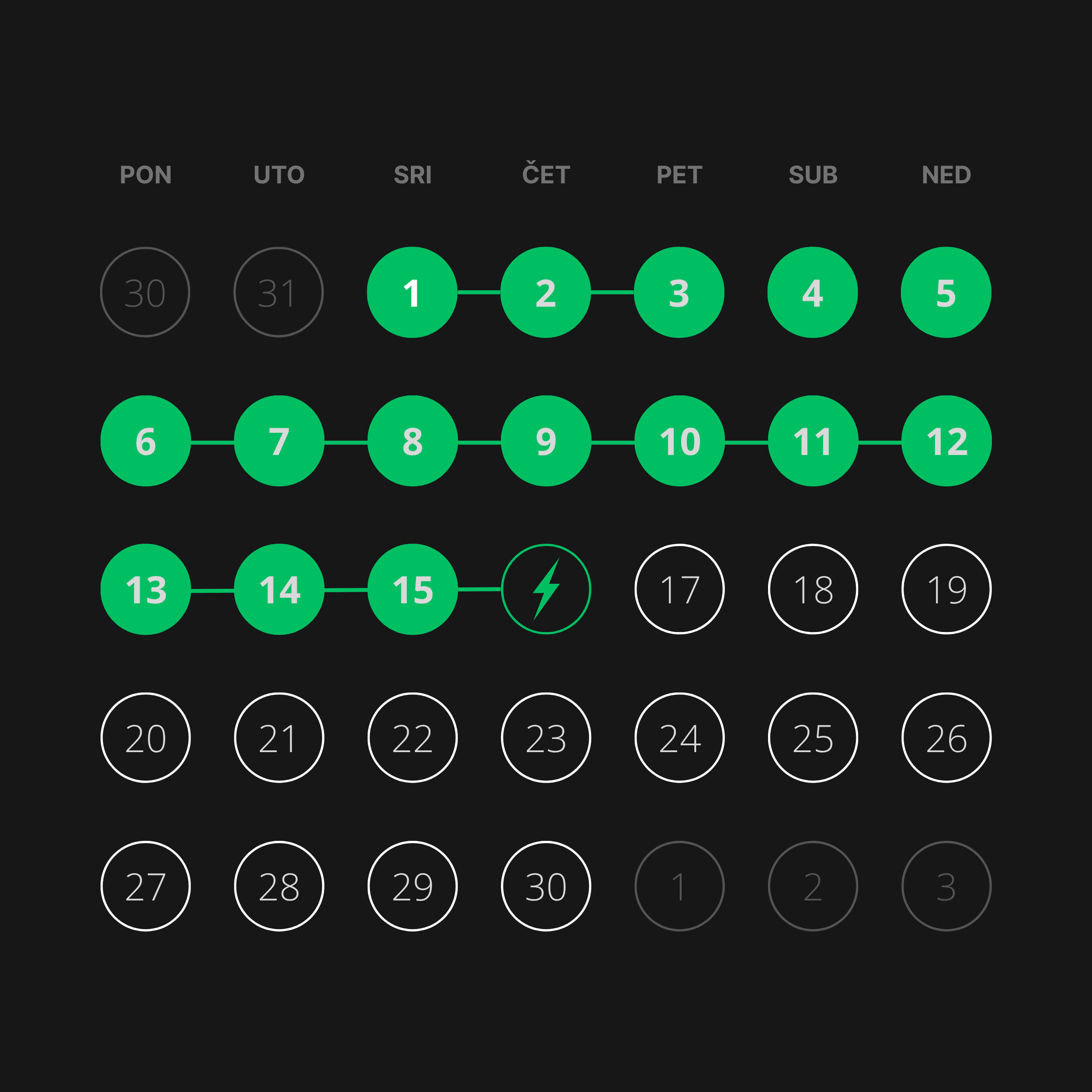 PBS+ ti vizualno prikazuje kontinuitet tvojih treninga – svaki dan koji odradiš postaje dio tvog „streaka”. Ovo ti pomaže da ostaneš motiviran/a, razviješ naviku i osjetiš ponos zbog ustrajnosti, bez pritiska ili uspoređivanja s drugima.